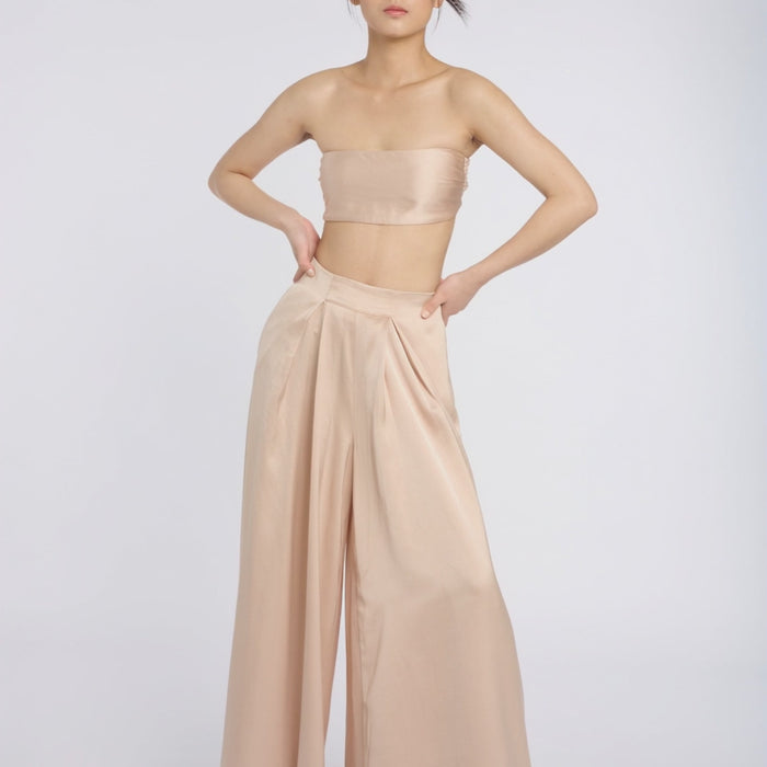 Chic Beige Strapless Top and Wide-Leg Pants Set