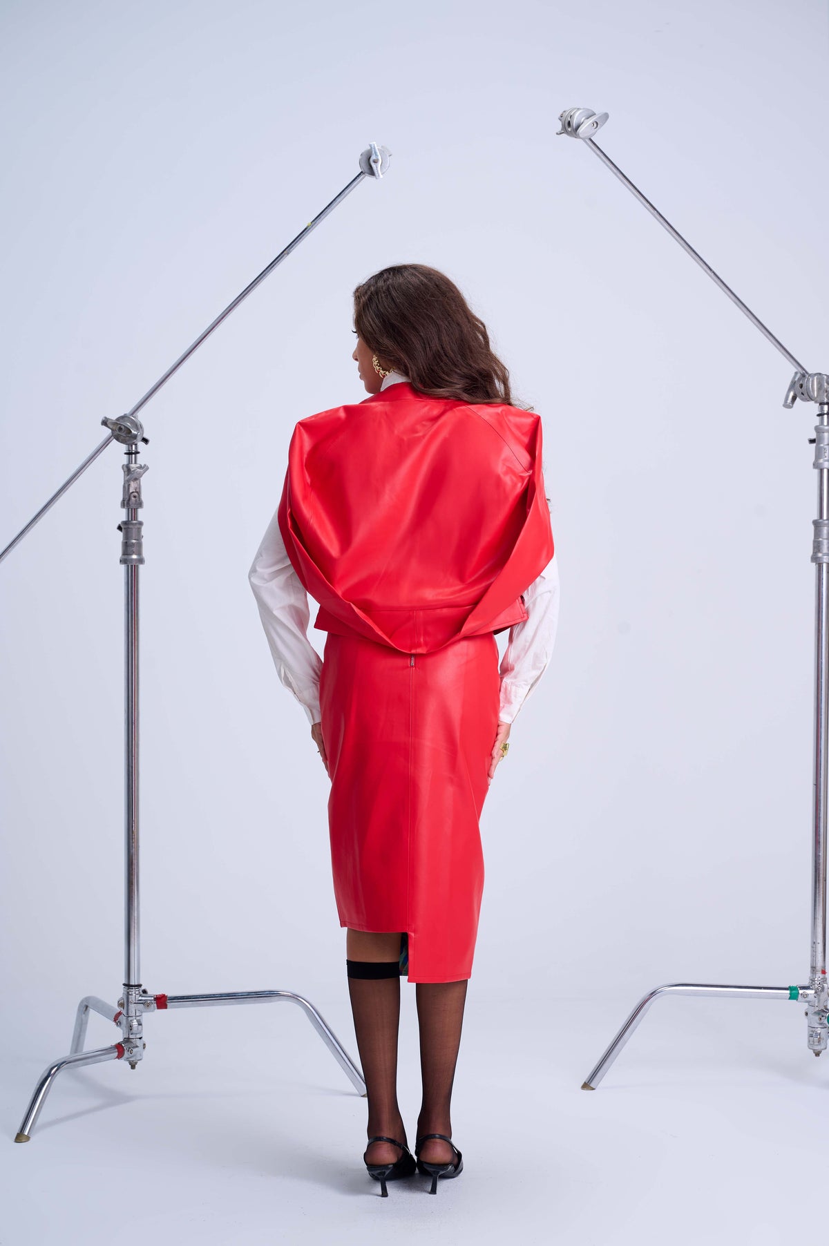 Cape Bomber Jacket — Bold Red Elegant Vegan Leather with Artistic Lined Interior
