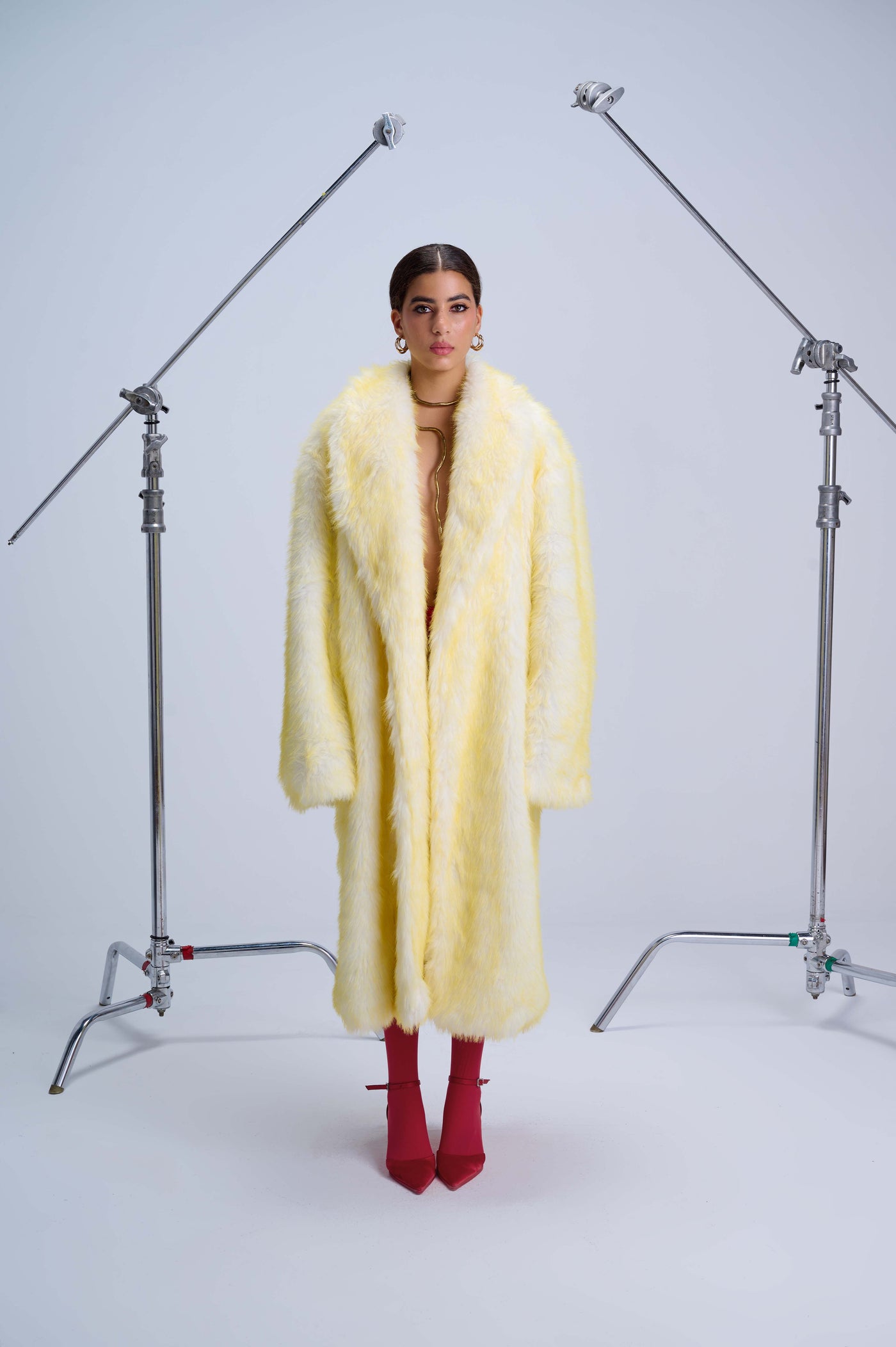 The Dramatic Oversized Fur Coat embodies pure expression and fearless elegance. Crafted from luxurious vegan fur in a daring yellow hue, it delivers both warmth and artistry through exaggerated volume, soft tactile texture, and a fluid oversized shape. Inside, the coat is fully lined with the collection’s signature wild artistic print, making every movement a statement. Designed to command attention while remaining cruelty-free and consciously made, it redefines outerwear as a form of wearable art — expressive, memorable, and timelessly bold.