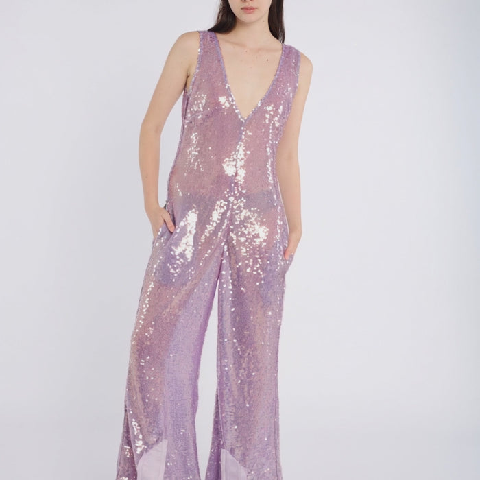 Step into the spotlight with our Glamorous Lavender Sequin Jumpsuit. This stunning piece features a deep V-neckline and sleeveless design, perfect for making a bold statement at any event. The jumpsuit is adorned with shimmering lavender sequins that catch the light beautifully, ensuring you stand out from the crowd. The wide-leg silhouette adds an elegant touch, while the concealed back zipper ensures a seamless fit. Crafted from high-quality materials, this jumpsuit offers both comfort and style. Ideal for parties, evening events, or any occasion where you want to shine.