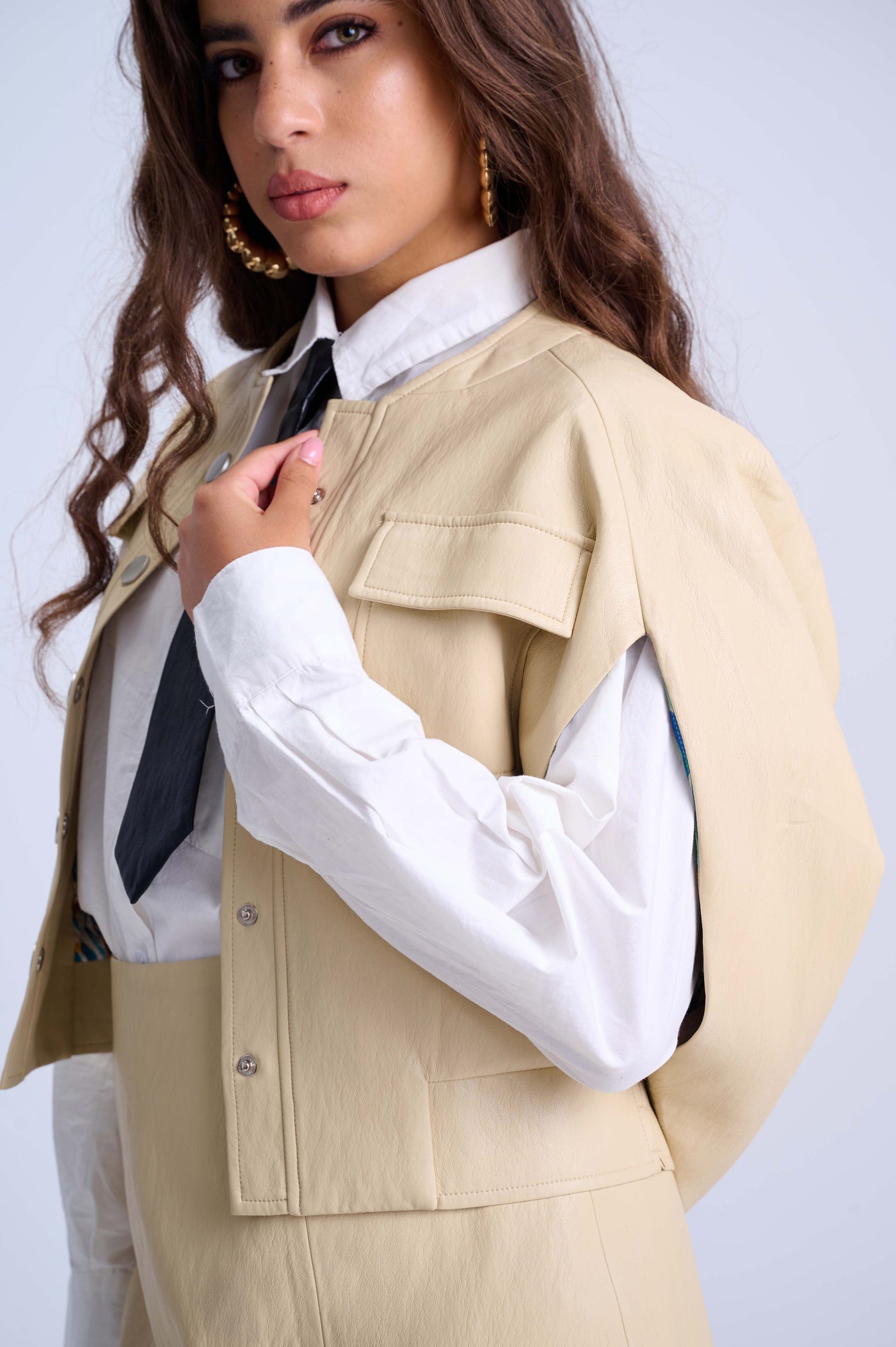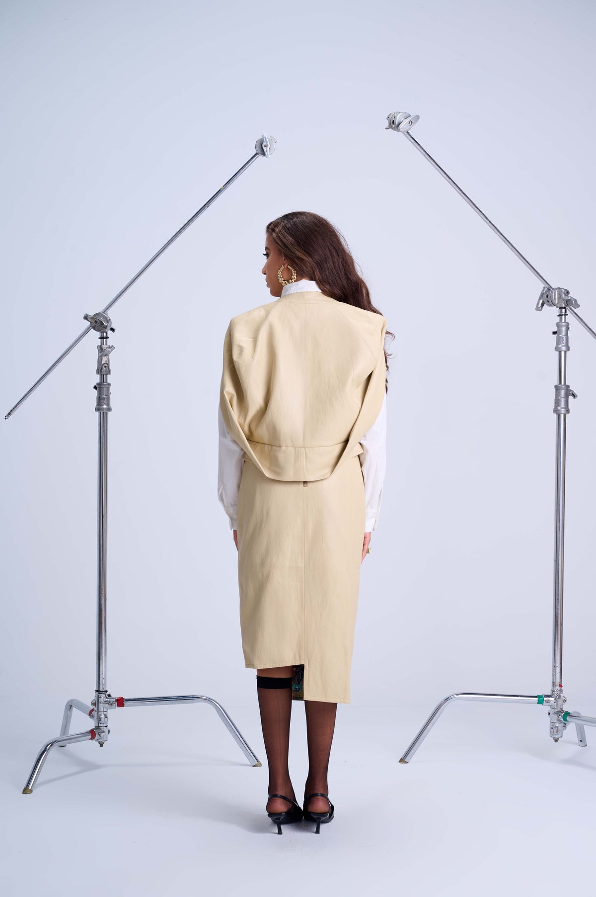 The Asymmetrical Pencil Skirt merges structured tailoring with fluid femininity. Crafted from smooth vegan leather, it features a pencil silhouette with an asymmetrical hem and a refined side slit that adds both ease and edge. The skirt is fully lined with the brand’s signature artistic wild-print satin, blending comfort with elevated craftsmanship. Designed in ivory yellow and bold red, this piece transitions effortlessly from day to night — pairing perfectly with the Cape Bomber Jacket or Oversized sweatshirt.