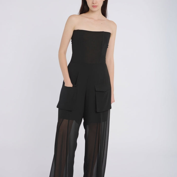 Turn heads with our Chic Black Strapless Jumpsuit with Sheer Wide-Leg Pants. This stunning jumpsuit features a strapless design and sheer wide-leg pants, perfect for making a bold fashion statement. The large pockets on the front of the thighs add a unique and practical touch. Crafted from high-quality materials, this jumpsuit offers both comfort and style, making it ideal for any special occasion. Whether you're attending a party, a formal event, or a night out, this jumpsuit ensures you stand out from the crowd.